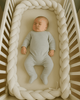 Tour de lit tressé vert beige blanc en coton doux pour bébé, protection et confort au lit.